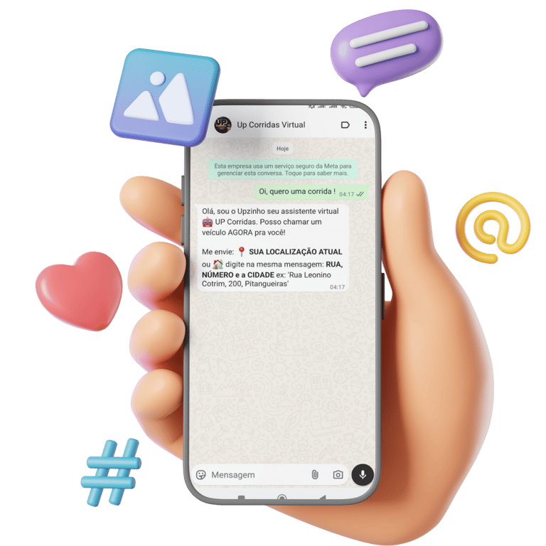 Com a UP Corridas, você não precisa esperar — você embarca! Nosso app conecta você ao motorista mais próximo com segurança, rapidez e conforto, além de oferecer a praticidade de solicitar corridas diretamente pelo WhatsApp.